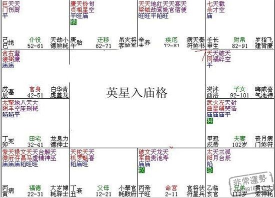 英星入廟格,是指破軍守命居子、午宮,與祿存、科權祿、左右、魁鉞加會者為本格。古代宜武職,離鄉背井可獲吉運現代適合經商,富貴雙全之命也。