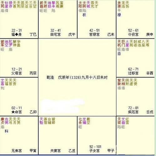 據傳朱元璋生於元朝天順帝天曆元年九月十八(即公曆1328年10月21日)丁未時,即:戊辰年壬戌月丁丑日丁未時,其紫微命盤如下: