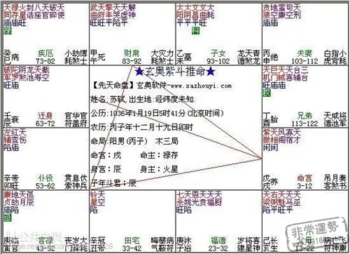 傳聞這是大才子蘇軾的命盤,紫微星坐命,天相輔佐,三方四正會天府星。紫微為帝王之星,入命,加輔佐星,身上已經有伴隨君王的跡象。